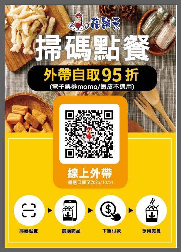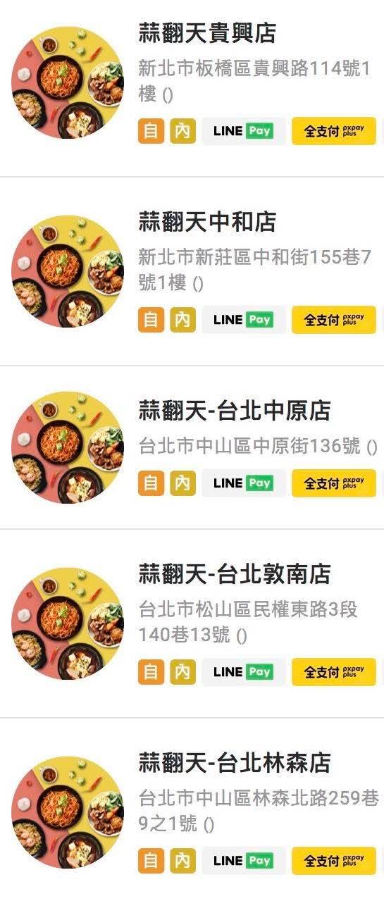 掃碼點餐自取[95折] 點餐無壓力 / 節省排隊等候時間 限定以下5間門市 蒜翻天(台北中原店) 台北市中山區中原街136號 蒜翻天(台北敦南店) 台北市松山區民權東路三段140巷13號 蒜翻天(台北林森店) 台北市中山區林森北路259巷9之1號 蒜翻天(板橋貴興店) 新北市板橋區貴興路114號 蒜翻天(新莊中和店) 新北市新莊區中和街155巷7號